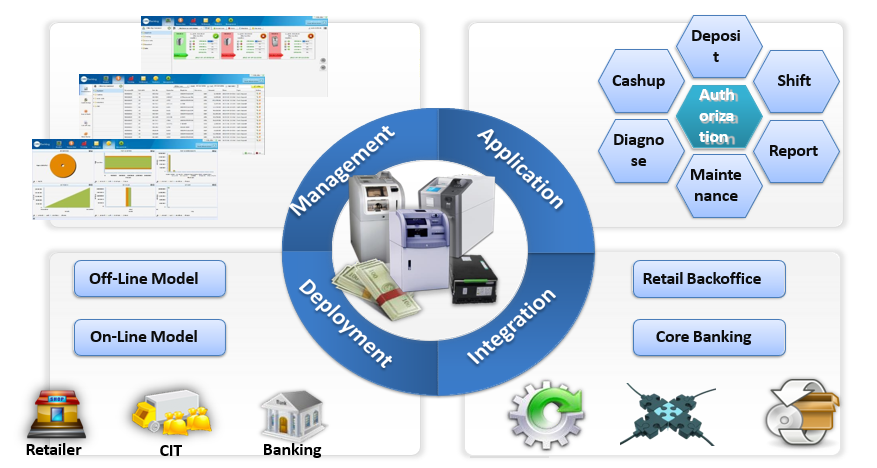 A software management platform called FEEL aDep, the solution offers an automatic cash processing experience to retailers in the store. The value proposition of this solution is to streamline the workflow of cash management and to free employees from repeated manual cash counting. It increases cash management efficiency while saving labor costs for retailers.